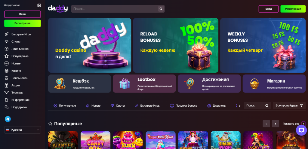 Казино Daddy предлагает пользователям широкий выбор игровых автоматов, Live-столов с живыми дилерами, крупномасштабные турниры, акции с промокодами. Высокотехнологичная площадка Дэдди гарантирует клиентам клуба полную безопасность и сохранность данных и проводимых денежных операций. Бонусная система и программа лояльности ресурса позволяют существенно сократить путь к реальному выигрышу.